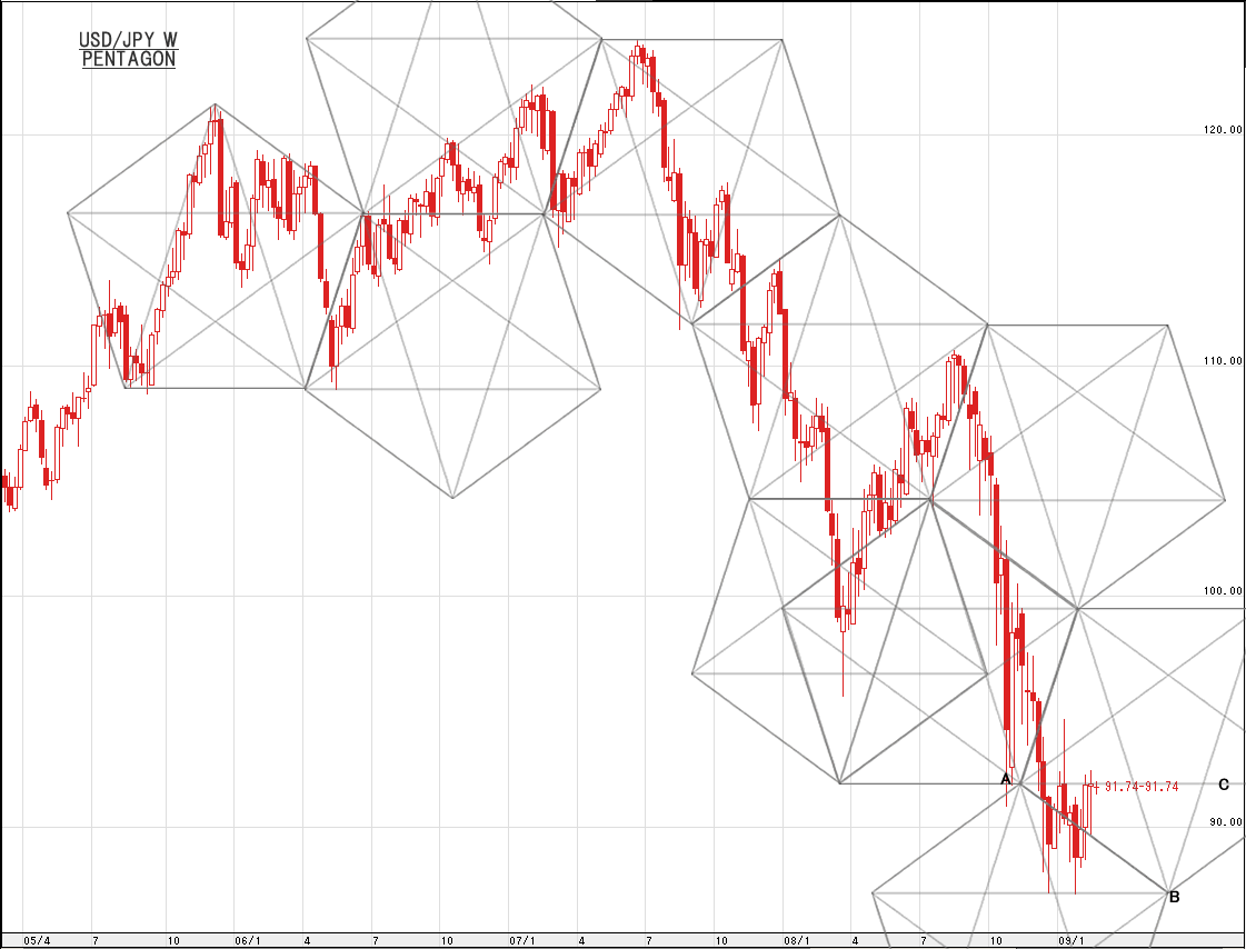 a39358b0.gif今日はドル/円の週足にペンタゴンチャートをひいてみた。