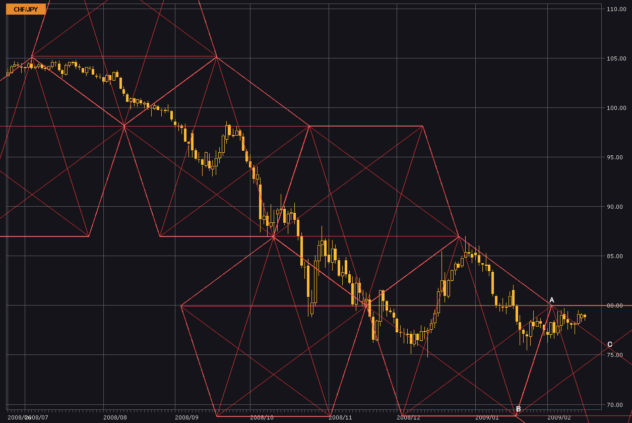 a372f6ea.gif今日はスイスフラン/円の日足に昨日と同様にペンタゴンチャートを引いてみる。