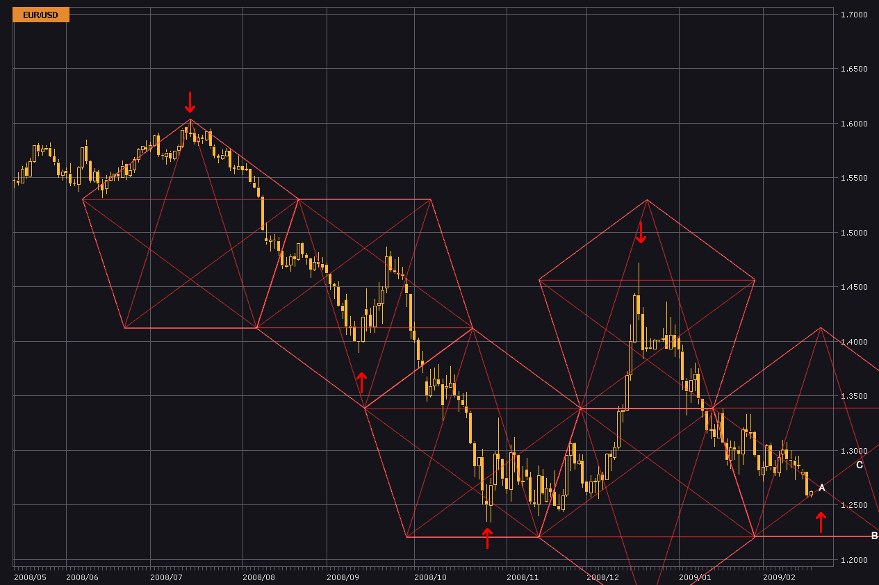 1d5c69f6.gifユーロ/ドルの日足にペンタゴンチャートを描いてみる。