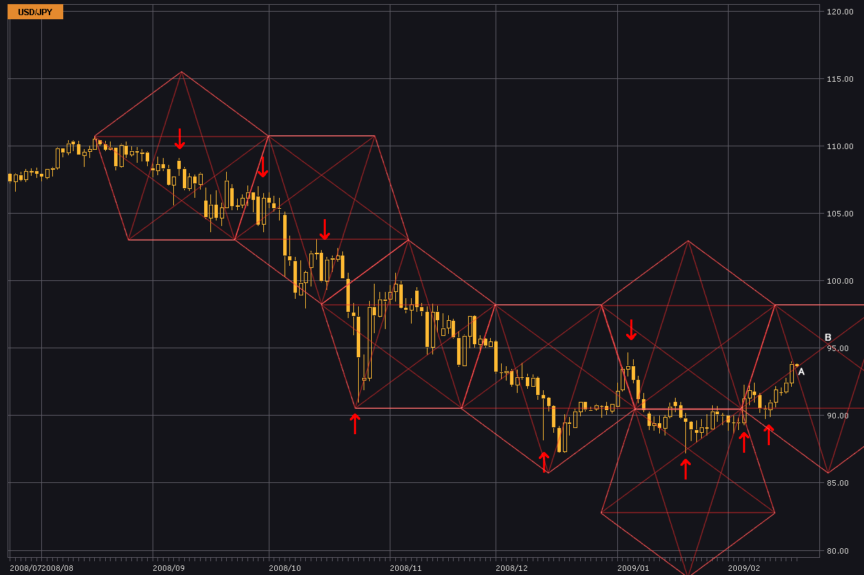 ペンタゴン同士の接点及び、昨日同様五角形の頂点付近がトレンドの転換を現している。