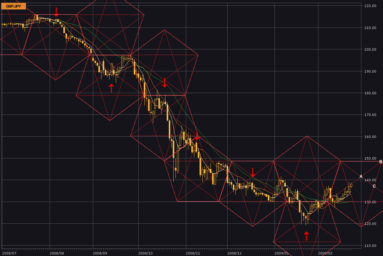 ポンド/円もだいぶ安くなってきたので、日足を使いペンタゴンチャートを引いて目先の動きを予測してみる。