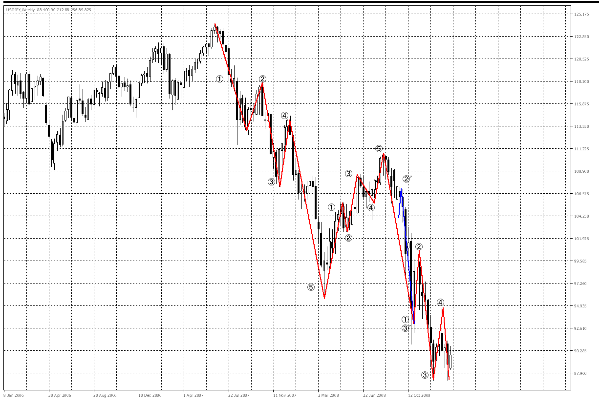 07年6月の高値124.13円から小さい5波を形成し08年3月に95.71円の安値をつけたⒶ、その後反発、08年8月10日に110.65円まで上昇Ⓑ、再度下落し08年12月14日に87.12円及び09年1月18日に87.13円のダブルボトムをつけたⒸ。